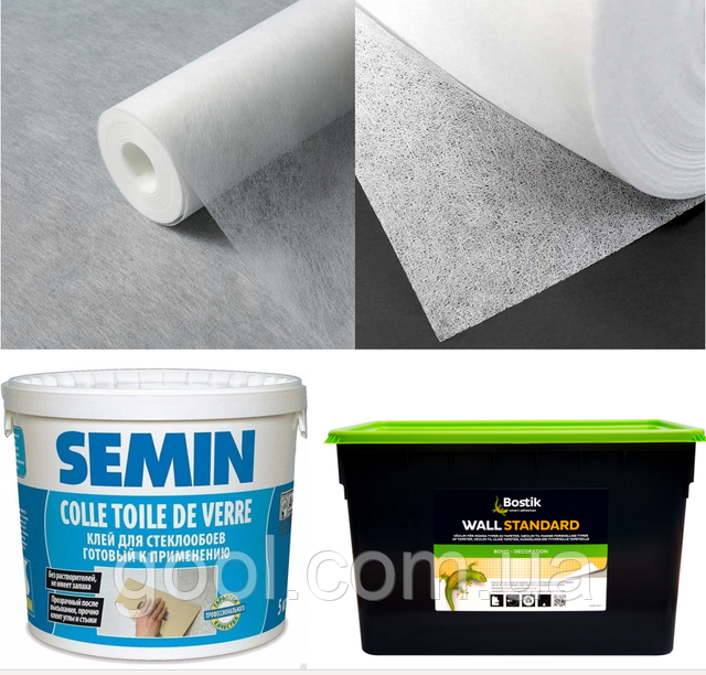 Клей для склополотна продається у відрах по 10 кг., якого у свою чергу вистачає один рулон шпалер 50 м2.