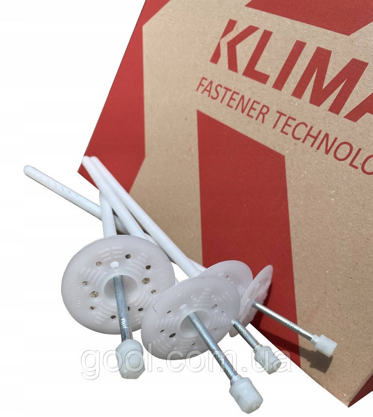 Дюбель фасадний з металевим стрижнем та термоголовкою. Дюбель з оцинкованим металевим цвяхом і термоголовкою призначений для кріплення плит з базальтової вати до бетонних, цегляних, кам'яних основах. Пластикова термоголовка запобігає появі містків холоду і з часом прояви на фасадах будівлях темних плям від звичайних металевих цвяхів, які можуть з часом іржавіти.