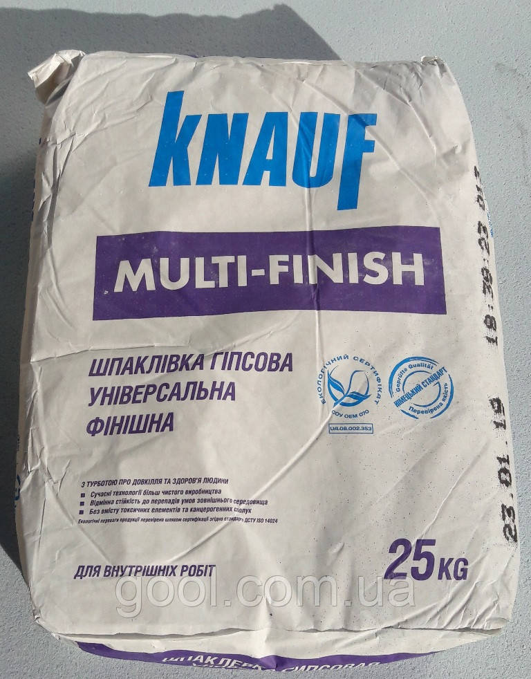 Шпаклівка фінішна гіпсова Knauf Мультифиниш 25 кг. ― матеріал на основі природного гіпсу дрібного помелу з додаванням пластифікаторів. Суха гіпсова суміш у мішках.