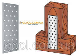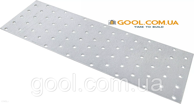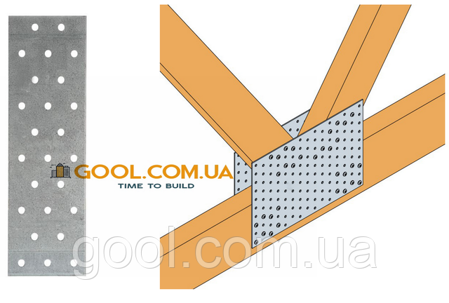 Металева перфорована пластина з отворами плоска застосовується для фіксації дерев'яних конструкцій між собою при створенні кроквяної системи даху та монтажу до основи з цегли, газобетону або бетону.