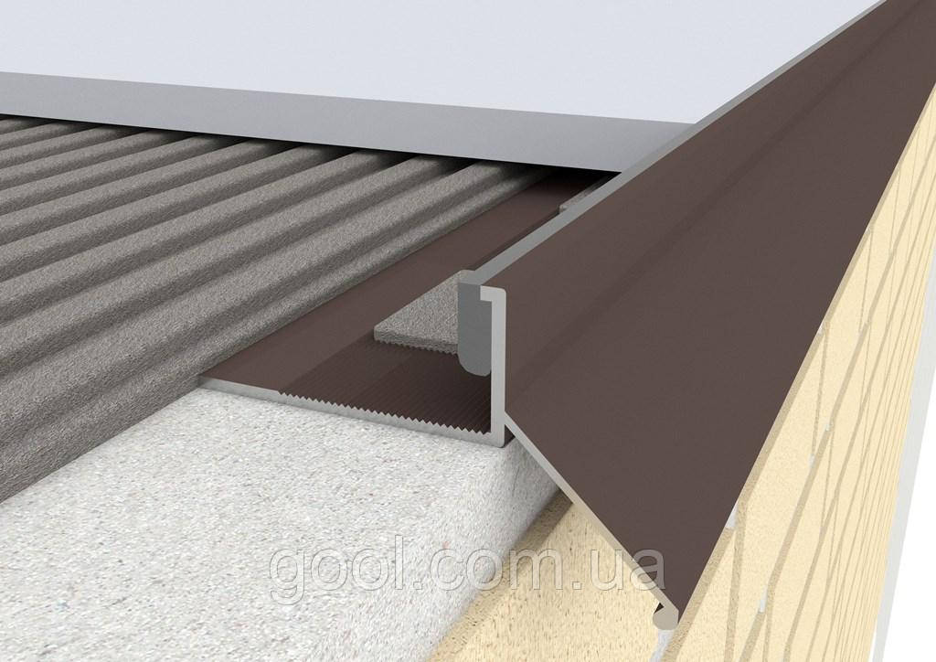 Капельник відлив алюмінієвий профіль MINI для відкритого балкона або тераси. Відведення води з поверхні, захист торця плитки та фасаду, довжина 2,7 метра, встановлюється під плитку, колір коричневий матовий.