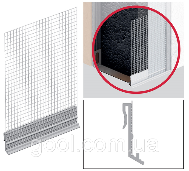 Профіль з капельником для стартового профілю - призначений для міцного з'єднання цокольного профілю з теплоізоляційним матеріалом і монтується на завершальній стадії облаштування фасаду на зовнішню алюмінієву полку цокольного профілю. Профіль запобігає виникненню тріщин в місцях з'єднання армуючого складу з цокольним профілем. Завдяки виступаючому капельники профіль забезпечує хороший відведення вологи системи і запобігає потраплянню вологи під ізоляційний матеріал. Стартовий (цокольний профіль) і завершальний профіль з щелочеустойчивой склосіткою це симбіоз будь-якого якісного теплого фасаду.